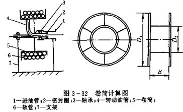 (2)卷筒尺寸的確定,為延長軟管使用壽命,卷筒寬度B根據操縱室的空間位置進行確定,一般情況用下式計算(見圖3-32):