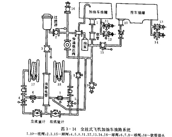 (1)油路系統要求與組成,根據加油車實際性能要求,通常是按上述的加油車五種功能,確定一個最佳油路系統,滿足作業需要,并力求結構簡單,工作可靠,工芤性良好,容易實現“三化”,管路較短。現以圖3-28大型加油車的油路系統為例,介紹設計中需注意的一些問題。該車的加油管中有閥16、油泵15、球閥7、過濾器3、流量計11、球閥5和10、絞盤總成8及加油槍等。油液是經過濾并計量后給受油容器加油的。為防止系統壓力超過規定值,在油
