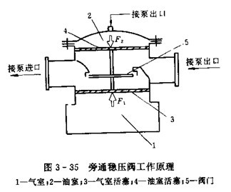 為旁通穩壓閥的工作原理圖。氣室1內充有一定壓力的空氣,上部油室2與泵的出口高壓油相通,氣室活塞3、油室活塞4與閥門5連成一體。在泵正常工用壓力下,氣室的氣體對活塞3的推力F1與油室油液對活塞4的推力F2相等,閥門5關閉不動,當泵出口壓力升高時,油室的壓力隨之升高,F2> F1,活塞在力F=F2-F1的作用下推動閥5下移,閥門被打開,泵的出口與入口油路接通,系統壓力被打開,泵的出口與入口油路接通,系統壓力開始下降,直至恢復原工作壓力,閥門又呈關閉狀態。