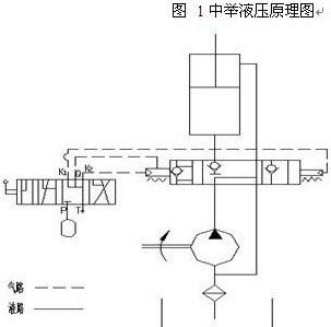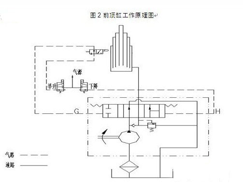 b、當自卸車需要中停時,把操縱氣閥的把手推向中停位置,此時,控制氣閥的進氣口IN與舉升TIP、下降口LOW斷開,氣控換向閥舉升口A關閉,油缸里的液壓油不能回流,換向閥的進油口P與回油口相通,壓力油回油箱,車廂停在某個位置。