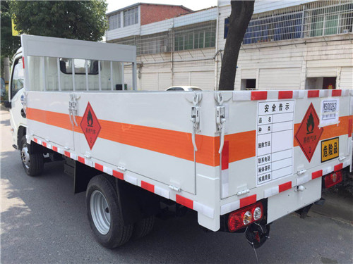 躍進小福星氣瓶運輸車廂體尺寸:3360*1615*550mm,整車尺寸:5185*1735*2060mm,邊板下開帶立柱,不帶高欄,廂體外板采用1.2mm厚冷軋板,內襯為矩形管骨架牢靠穩定,有靜電帶,滅火器,防火罩。整車國標反光標示及警告標志。