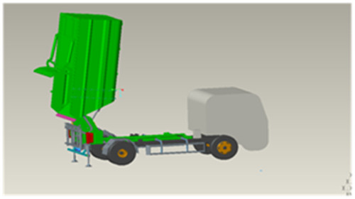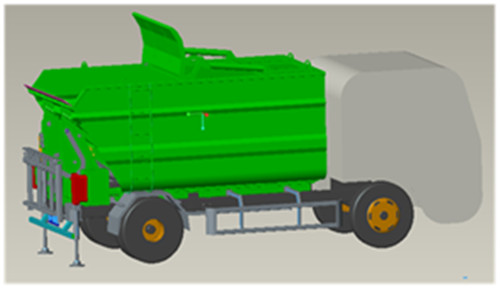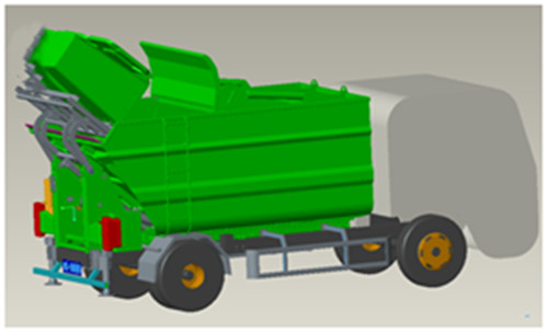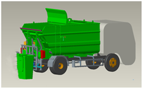 1、垃圾桶置于車輛后方上料機(jī)構(gòu)處,垃圾桶至壓桶限位處