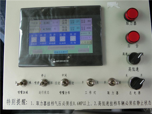 4 瀝青的灑布控制不僅可以在駕駛室內(nèi)通過智能觸屏電腦完成,也可以在車尾的操作平臺(tái)上進(jìn)行控制;