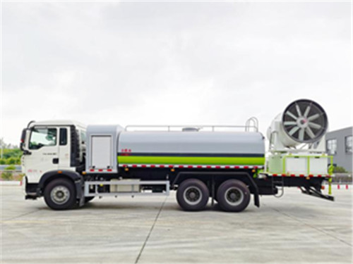 多功能抑塵車主要結構是在行走機構上加裝方型大容積水罐、高效遠程霧炮系統、大功率專用自吸自排水泵,中低壓沖洗灑水系統、綠化灑水高炮(可選裝自動灑水高炮,在罐體前端)等等而改裝組成。帶前部沖洗路面噴灑裝置,兩側面噴灑裝置,帶后部工作平臺、平臺上安裝綠化灑水炮(炮噴射形狀可調),可調直沖狀、大雨、中雨、毛毛雨,可連續調節,射程可達28米,垂直吸程≤7米,另加裝高效率車載式風送噴霧機,噴藥炮霧化效果好,可遠程噴霧。帶消防接口、自流閥,可自吸自排。