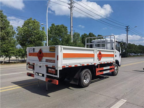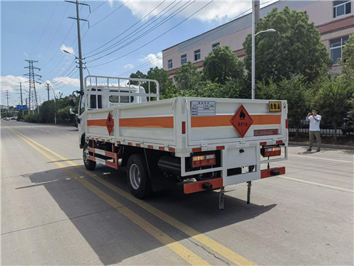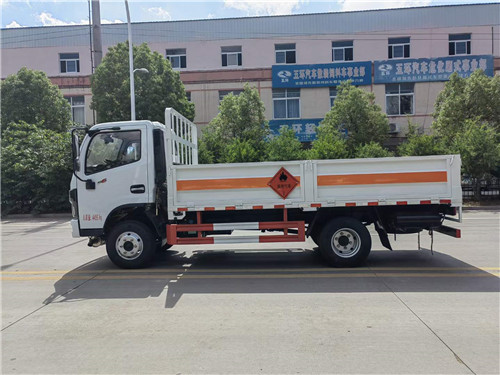 國六東風4.2米藍牌氣瓶運輸車倉欄配置:嚴格按照公告尺寸制作,邊2底3材質,帶可卸式高欄,底板上鋪靜電膠皮,配備滅火器,三角頂燈,靜電拖帶等,嚴格按照國家危險品法規進行“易燃氣體”標識粘貼等。