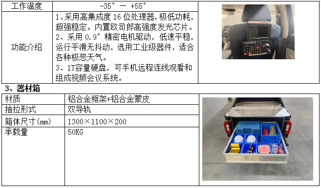 消防員乘員室可乘坐5人,前排2人,后排3人。車身前部為乘員室+攝像頭顯示控制系統(tǒng)+喊話系統(tǒng),后部為器材箱。器材箱為鋁合金骨架結(jié)構(gòu),抽拉屜,裝載量大。
