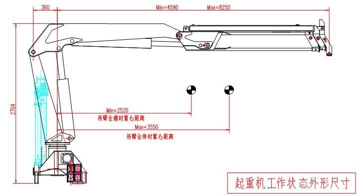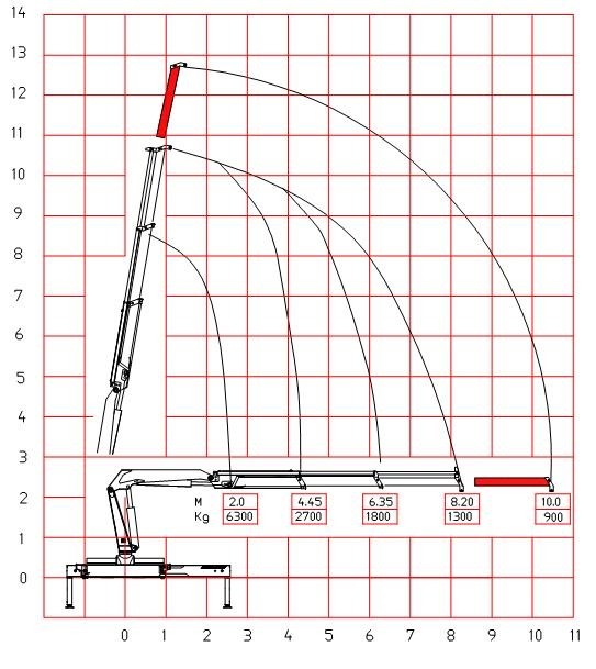 最大起升質量 6300kg 油箱容積 100L 最大起升力矩 12.6T.m 回轉角度 400度 推薦功率 30KW 起重機自重 2120kg 液壓系統最大流量 40L/min 安裝空間 1070mm 液壓額定系統壓力 28MPa